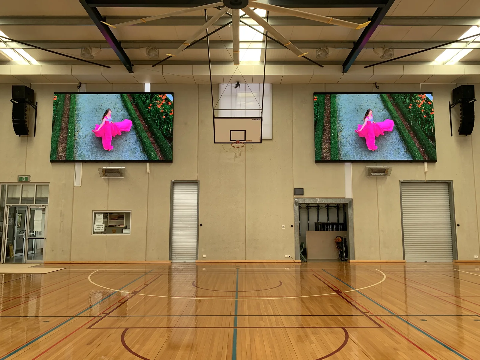 Cabinets are sized to the hall — typically P3–P5 indoor V-SPEC for main court walls — with software-controlled brightness so the screen suits both daytime training and evening fixtures. Mounts are flush, slim-line and impact-aware where they sit close to play.